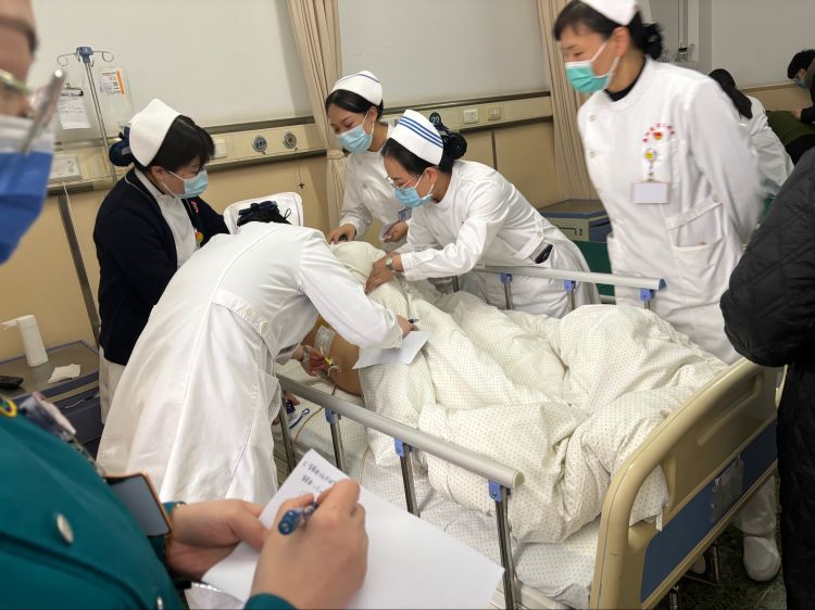 了解患者基本情況后,王爽一行來到病房,責任護士對患者進行了詳細的體格檢查。大家對患者進行溫情溝通,評估患者的飲食、疼痛度,查看患者情況及各項護理措施落實情況,對存在的疑難問題進行了現(xiàn)場指導。