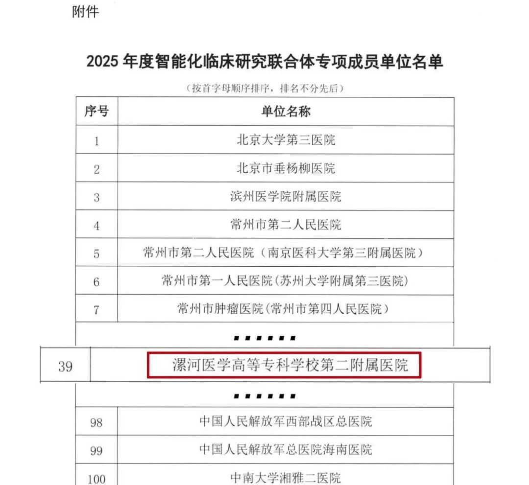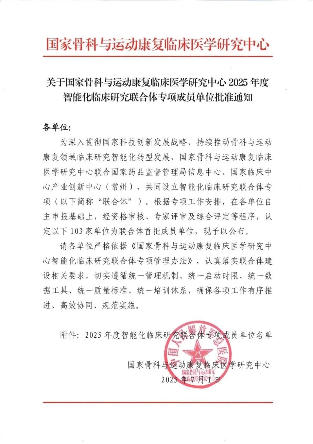 由國(guó)家骨科與運(yùn)動(dòng)康復(fù)臨床醫(yī)學(xué)研究中心(以下簡(jiǎn)稱“國(guó)家臨床中心”)聯(lián)合國(guó)家藥品監(jiān)督管理局信息中心、國(guó)家臨床中心產(chǎn)業(yè)創(chuàng)新中心(常州)共同設(shè)立的“2025年度智能化臨床研究聯(lián)合體專項(xiàng)”已完成首批成員單位遴選,共103家單位成功入選(具體名單見(jiàn)文末附件),覆蓋全國(guó)26個(gè)省份。 其中漯河醫(yī)專二附院成功入選國(guó)家臨床中心“智能化臨床研究聯(lián)合體專項(xiàng)”首批成員單位