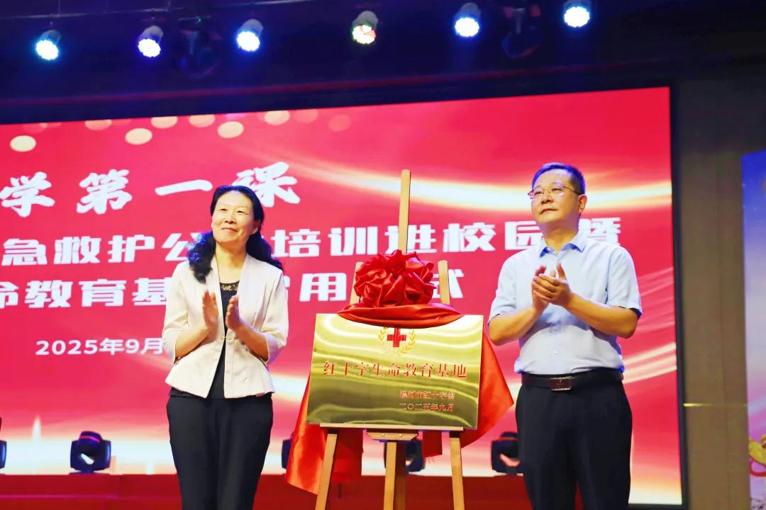儀式上,郭峰發(fā)表致辭,表示生命教育基地的建立及應(yīng)急救護(hù)培訓(xùn)的開展,是守護(hù)青少年健康成長的重要舉措。趙國利宣讀源匯區(qū)實驗學(xué)校紅十字會批復(fù)文件,孫穎華和郭峰共同為“源匯區(qū)實驗學(xué)校紅十字生命教育基地”揭牌,學(xué)生代表張雅涵上臺表達(dá)對應(yīng)急救護(hù)事業(yè)的憧憬,李紅臣介紹了學(xué)校紅十字社團(tuán)的基本情況,闡述了紅十字生命教育基地啟用的重要意義,以及對未來發(fā)展的規(guī)劃。