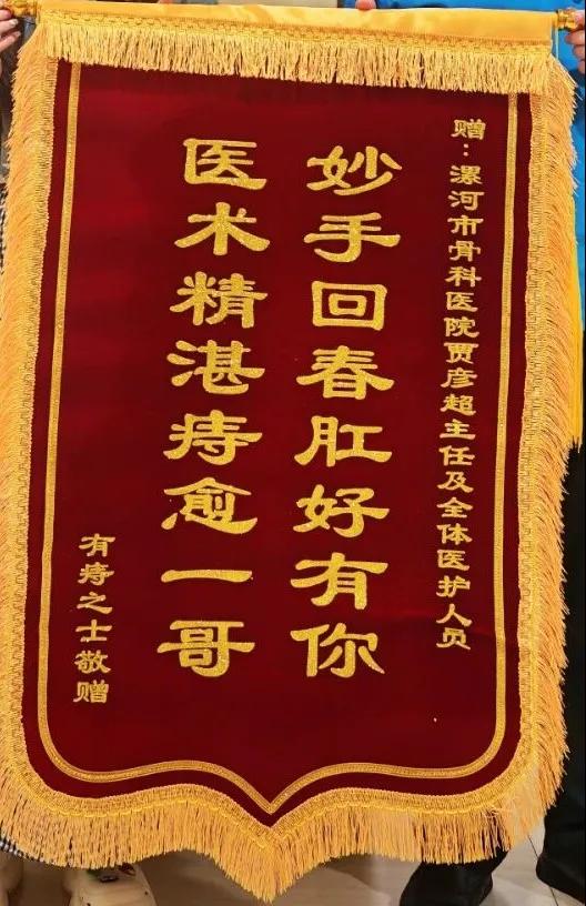 近日,漯河醫(yī)專二附院(漯河市骨科醫(yī)院、漯河市立醫(yī)院)肛腸科收到一面滿載心意的錦旗?;颊呶罩Z彥超主任的手再三致謝,錦旗上“妙手回春肛好有你,醫(yī)術(shù)精湛痔愈一哥”十六個(gè)大字,既是對醫(yī)護(hù)人員專業(yè)能力的肯定,更是對肛腸科中西醫(yī)結(jié)合診療水平的認(rèn)可。