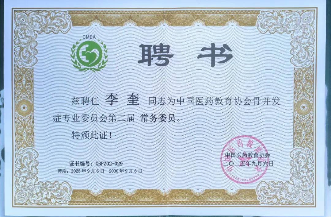 漯河醫(yī)專二附院名譽(yù)院長李奎教授獲聘中國醫(yī)藥教育協(xié)會(huì)骨并發(fā)癥專業(yè)委員會(huì)常務(wù)委員