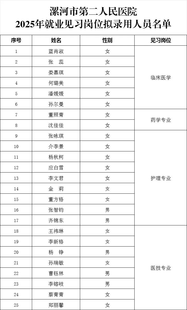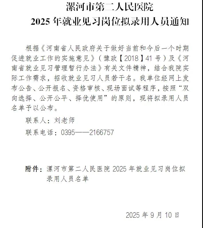 【公示】漯河市第二人民醫(yī)院2025年就業(yè)見(jiàn)習(xí)崗位擬錄用人員通知