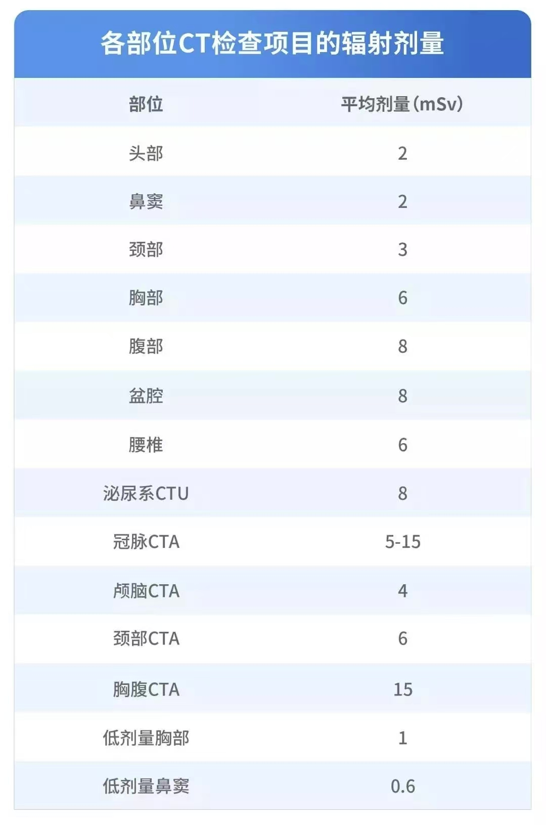 CT檢查劑量較普通X線高的多,成年人常規(guī)體檢及檢查不必過度擔(dān)心。各部位CT檢查項(xiàng)目輻射平均劑量根據(jù)部位不同輻射劑量不同:例如頭部一次CT接受輻射劑量大約2mSv,低劑量胸部檢查1-2mSv,腹部、盆腔大約6-8mSv。做一次頭部CT相當(dāng)于每日抽了20支煙。