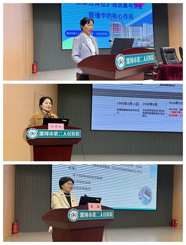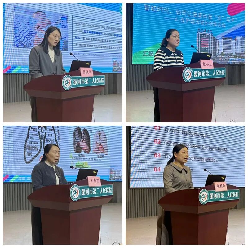 在學(xué)術(shù)交流環(huán)節(jié),多位護理專家圍繞健康教育的新理念、新方法與新技術(shù)展開深入探討。市二院護理部主任高凱霞分享了《健康教育在護理質(zhì)量與安全管理中的核心作用》;市中心醫(yī)院護理部副主任劉素紅講解了《基于賦能理論構(gòu)建三級醫(yī)院健康教育護士健康素養(yǎng)提升路徑》;市六院護理部副主任崔臻以《賦能·融合——構(gòu)建新時代醫(yī)院護理健康教育體系的實踐與思考》為題進行交流;臨潁縣人民醫(yī)院護理部副主任張潁歌介紹了《基于行為窗口理論的護士高效能溝通技巧》;市二院普外科護士長王書霞圍繞《腫瘤患者營養(yǎng)與身心健康:吃出健康,動出活力》展開講解;麻醉手術(shù)部副護士長莫敬敬探討了《基于指南的靜脈治療健康教育及溝通模式》;小兒外科骨干護士張小玉則就《智能時代,如何讓健康科普“活”起來?——AI在護理領(lǐng)域的創(chuàng)新實踐》進行分享。專家們結(jié)合臨床實例,展示了健康教育的最新成果與實踐經(jīng)驗,內(nèi)容充實,視角多元,為參會者帶來深刻啟發(fā)。
