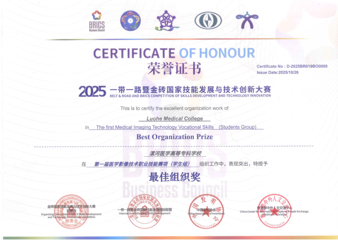 10月23日至26日,2025“一帶一路”暨金磚國家技能發(fā)展與技術(shù)創(chuàng)新大賽——醫(yī)學(xué)影像技術(shù)職業(yè)技能賽項(xiàng)在北京衛(wèi)生職業(yè)學(xué)院舉行。醫(yī)學(xué)影像團(tuán)隊(duì)在周山主任帶領(lǐng)下,與來自全國61所職業(yè)院校的優(yōu)秀師生同場(chǎng)競(jìng)技,師生團(tuán)隊(duì)奮勇爭先、發(fā)揮出色,在所有學(xué)生實(shí)踐技能比賽及教師教學(xué)比賽中均獲優(yōu)異獎(jiǎng)項(xiàng)。