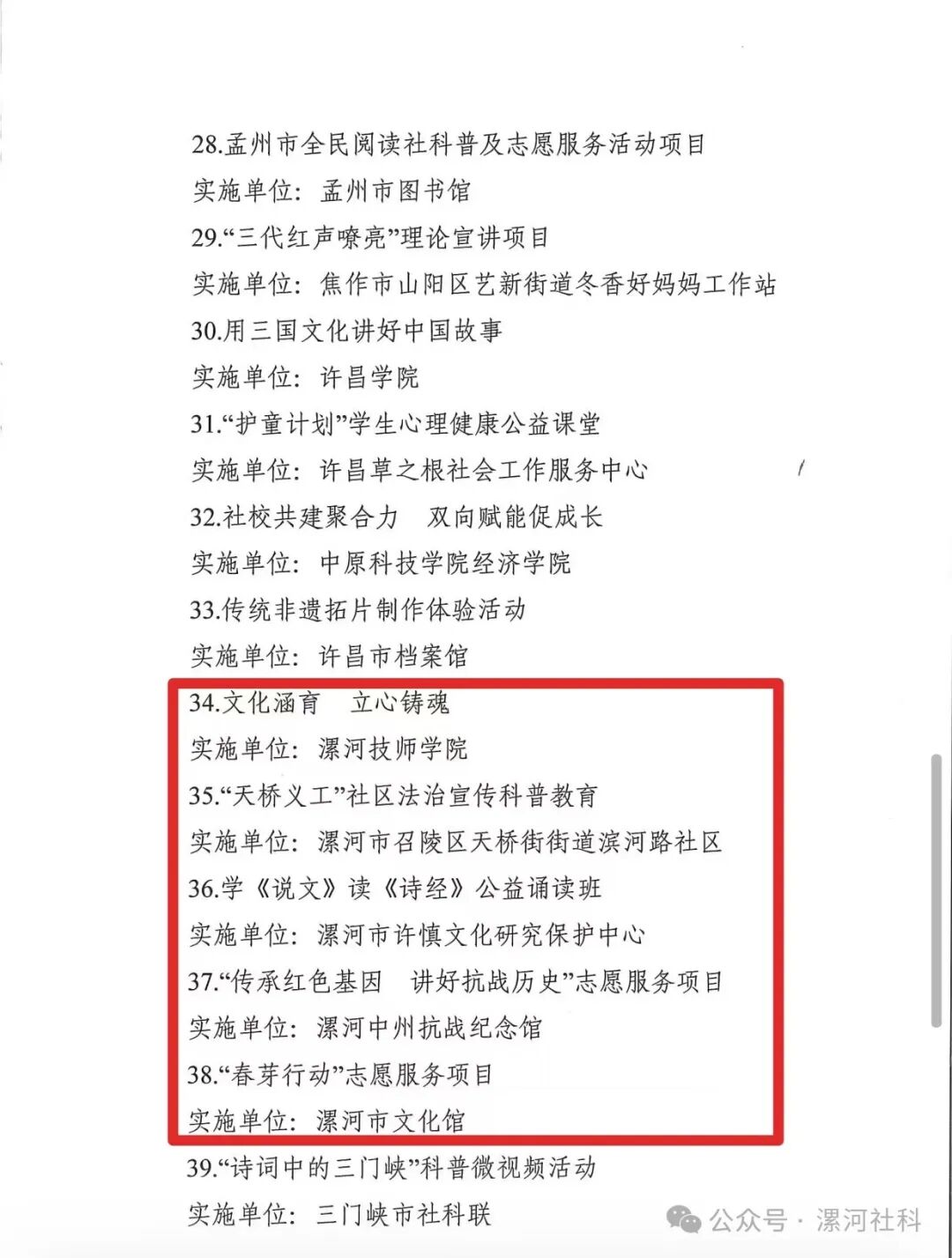 2024年表現(xiàn)突出社科普及志愿服務活動項目(5個):文化涵育 立心鑄魂(實施單位:漯河技師學院);“天橋義工”社區(qū)法治宣傳科普教育(實施單位:漯河市召陵區(qū)天橋街街道濱河路社區(qū));學《說文》讀《詩經(jīng)》公益誦讀班(實施單位:漯河市許慎文化研究保護中心);“傳承紅色基因 講好抗戰(zhàn)歷史”志愿服務項目(實施單位:漯河中州抗戰(zhàn)紀念館);“春芽行動”志愿服務項目(實施單位:漯河市文化館)