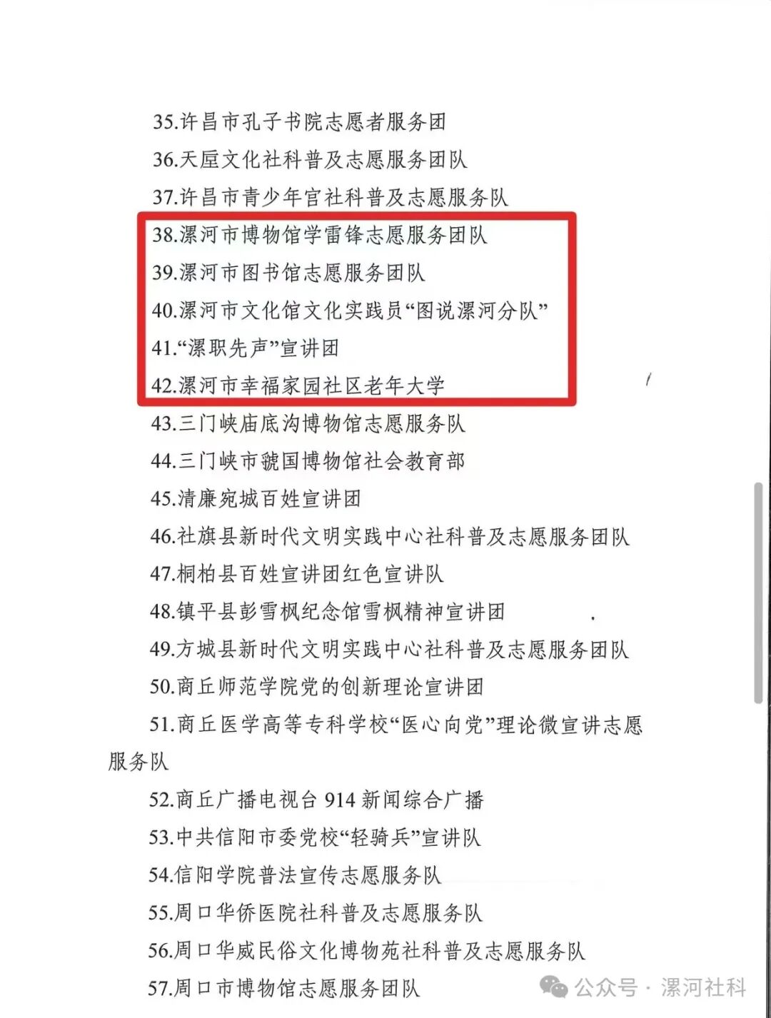 2024年社科普及志愿服務活動表現(xiàn)突出社科普及志愿服務團隊(5個):漯河市博物館學雷鋒志愿服務團隊;漯河市圖書館志愿服務團隊;漯河市文化館文化實踐員“圖說漯河分隊”;“漯職先聲”宣講團;漯河市幸福家園社區(qū)老年大學