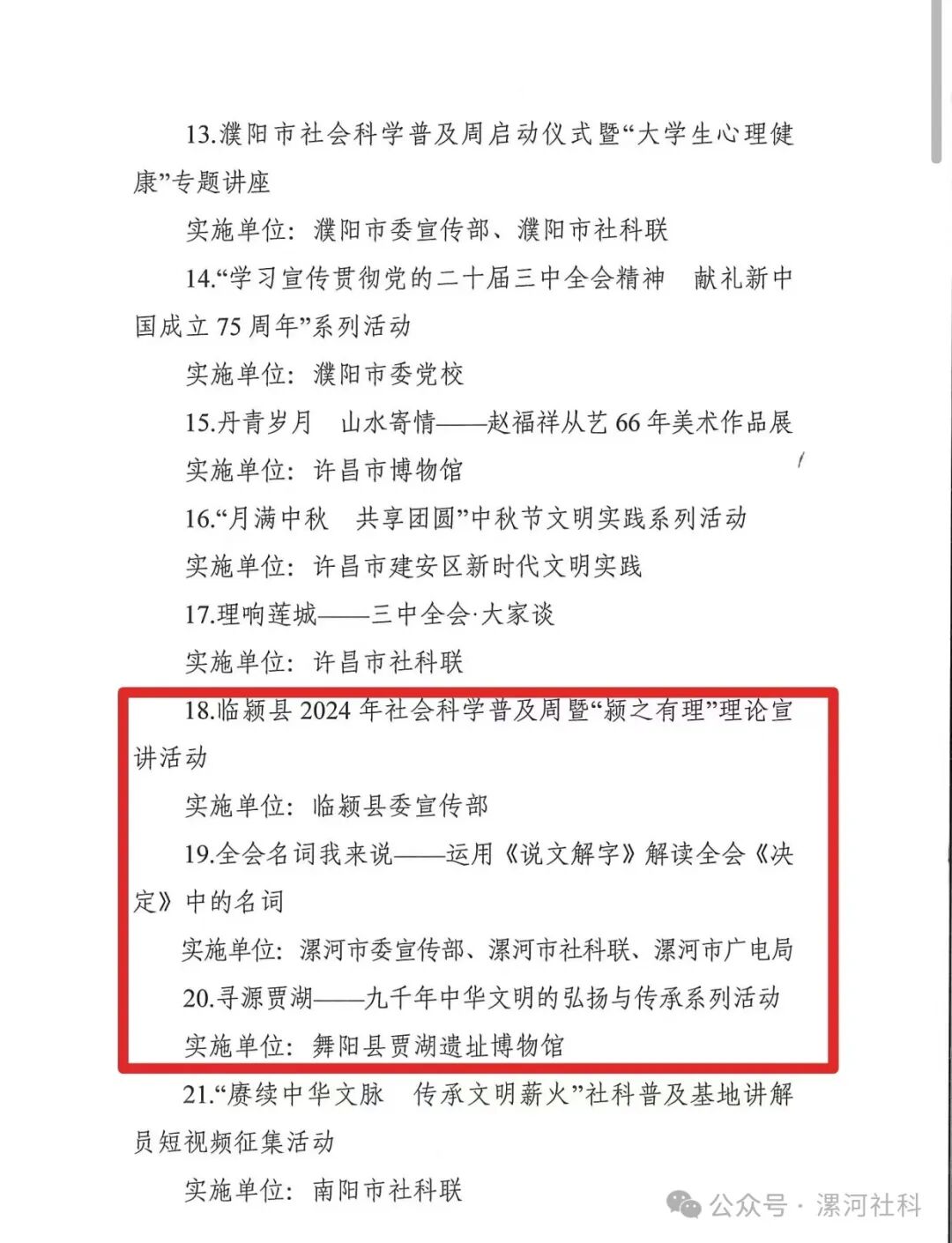 2024年河南省社科普及周活動表現(xiàn)突出特色活動(3個):臨潁縣2024年社會科學普及周暨“潁之有理”理論宣講活動(實施單位:臨潁縣委宣傳部);全會名詞我來說——運用《說文解字》解讀全會《決定》中的名詞(實施單位:漯河市委宣傳部、漯河市社科聯(lián)、漯河市廣電局);尋源賈湖——九千年中華文明的弘揚與傳承系列活動(實施單位:舞陽縣賈湖遺址博物館)