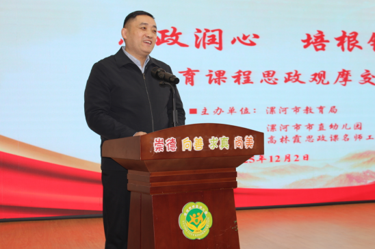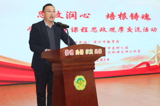 霜染初冬凝暖意,教潤(rùn)童心啟新章。為深入貫徹落實(shí)立德樹人根本任務(wù),探索符合幼兒年齡特點(diǎn)的課程思政模式與方法,提升幼兒園教師開展課程思政的能力與水平,增進(jìn)園所間的交流學(xué)習(xí),12月2日上午,漯河市學(xué)前教育課程思政觀摩交流活動(dòng)在市直幼兒園舉行。漯河市教育局黨組成員、副局長(zhǎng)聶廣橋出席。市教育局秘書科科長(zhǎng)馮文權(quán),市教育教學(xué)研究室政治教研員、市大中小學(xué)思政課一體化建設(shè)委員會(huì)秘書長(zhǎng)夏忠新,市屬幼兒園主管園長(zhǎng)、骨干教師;市幼兒園領(lǐng)航工作室共同體單位、市直幼兒園教育集團(tuán)主管領(lǐng)導(dǎo)、骨干教師以及市大中小學(xué)思政課名師工作室主持人參與了本次活動(dòng)。