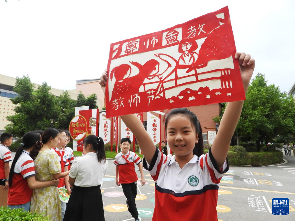 9月9日,四川達(dá)州高新區(qū)實(shí)驗(yàn)學(xué)校學(xué)生展示獻(xiàn)給老師的創(chuàng)意剪紙作品。