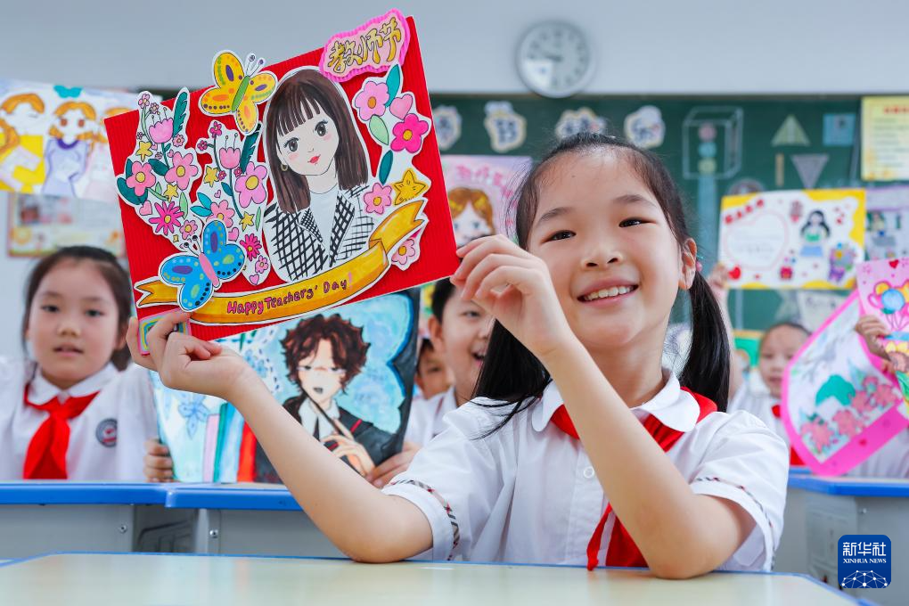 9月9日,在江蘇省句容市實(shí)驗(yàn)小學(xué),學(xué)生展示手工制作的教師節(jié)賀卡。