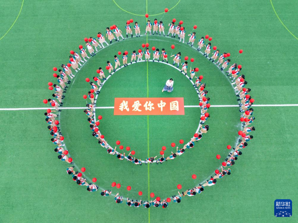9月28日,江蘇省泰州市姜堰區(qū)東橋小學教育集團東板橋校區(qū)學生學唱愛國歌曲,迎接國慶節(jié)(無人機照片)。